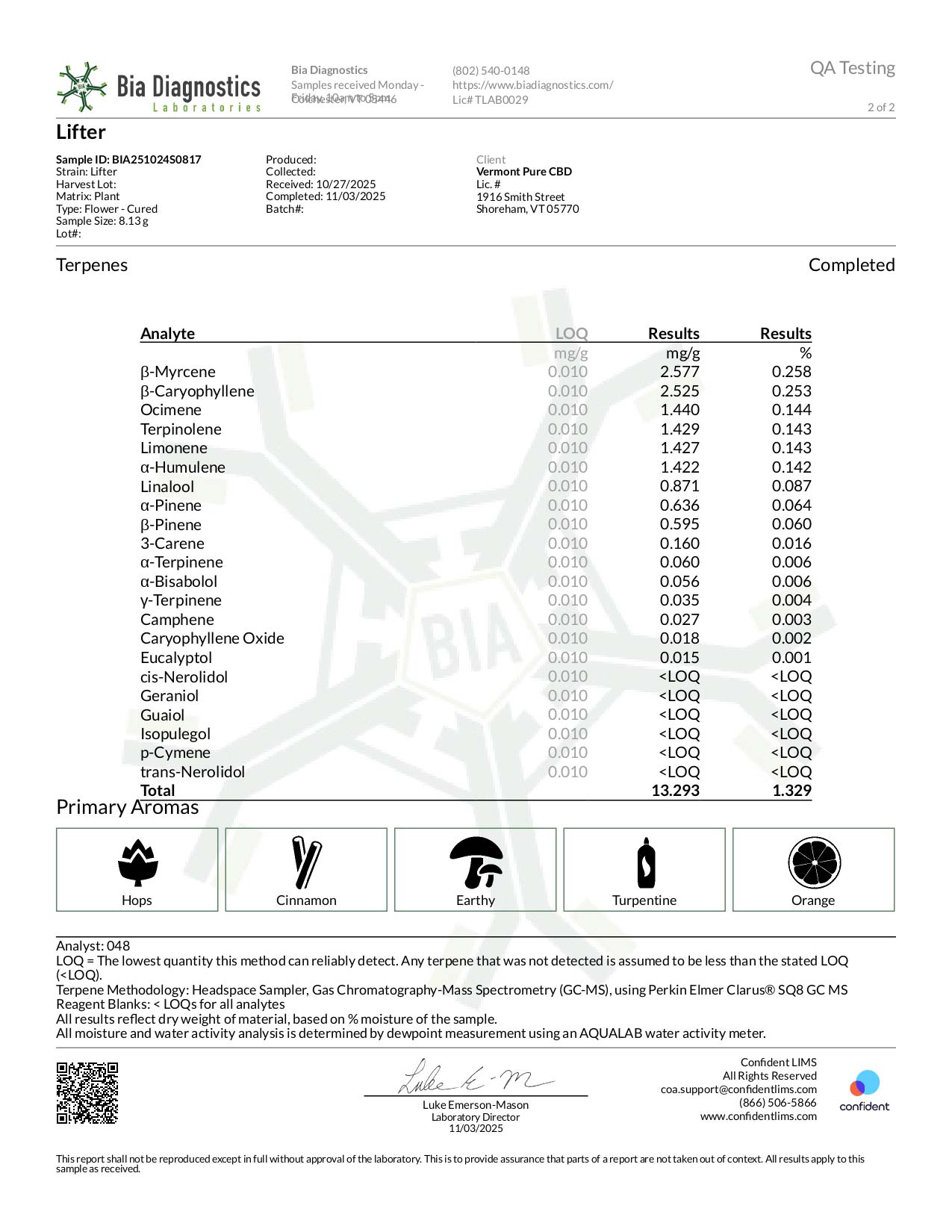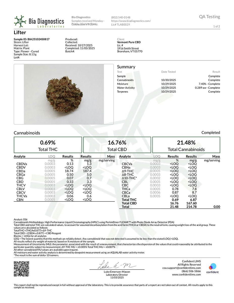 Lifter CBD Hemp Flower is frosty with trichomes, high in CBD and smells earthy with floral undertones. When smoked, the refreshing sweet and pine flavors are released. The common combination of Myrcene, Pinene, and Humulene create a great sedative effect prefect for leisure. The Lifter strain contains generous levels of CBD alongside other cannabinoids and terpenes that help create the entourage effect apparent in all our offerings.